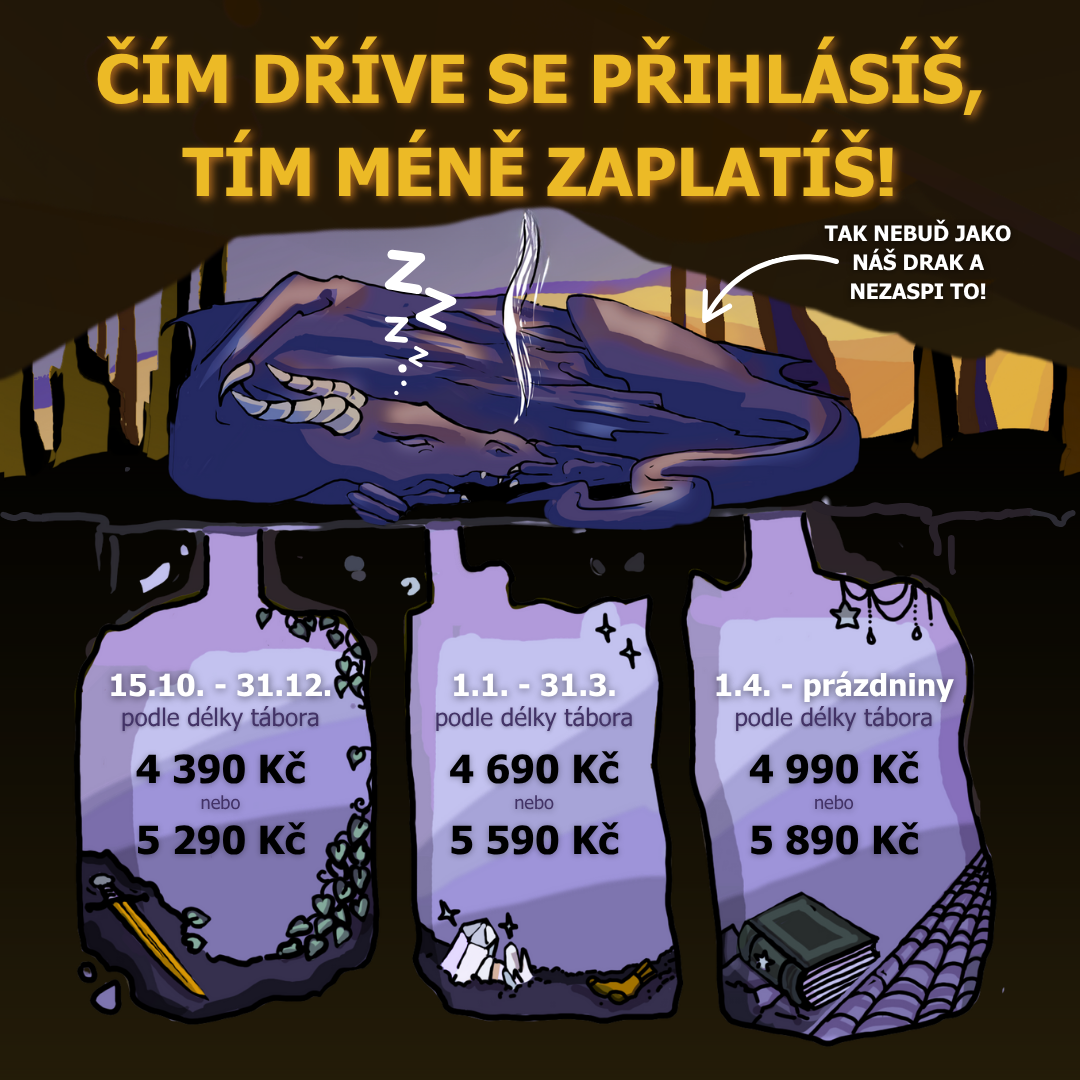 Pokud se navíc stihneš přihlásit do 31.12.2025, budě tě tábor stát jen 4390 Kč nebo 5 290 Kč (podle délky tábora).