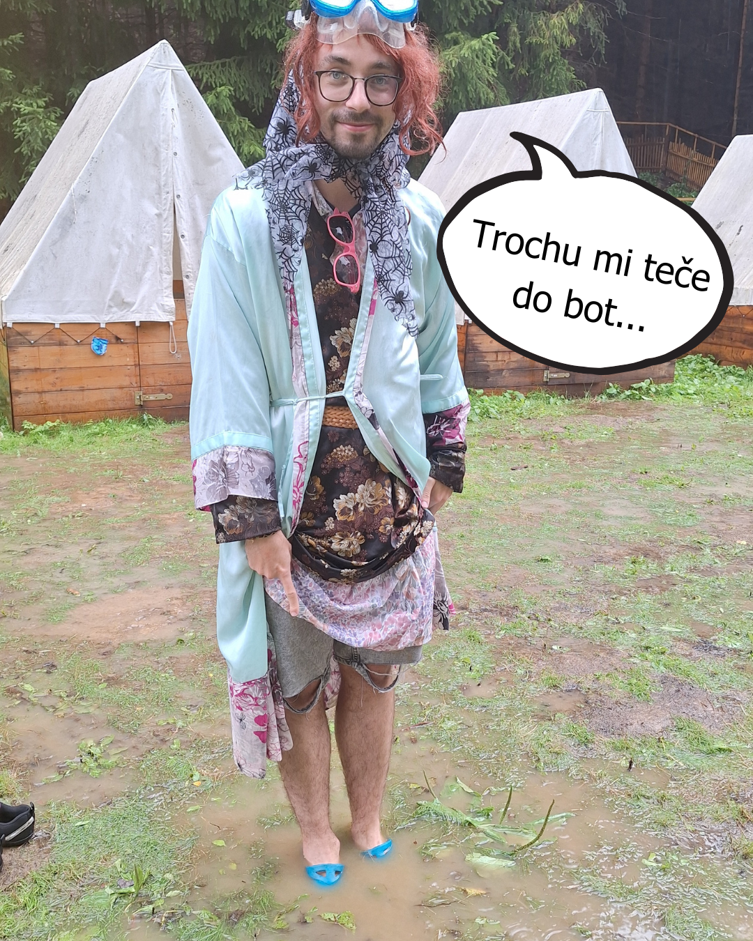 Ve zkratce - je tu fakt mokro. A to nejen když prší. Naše tábořiště je zastrčené v údolí s potokem a ve vzduchu se drží vlhkost. Když pak večer i ráno padne rosa, tak se tu drží docela dlouho. Údolí je ze všech stran obklopeno stromy, takže slunce sem nedosvítí ani hned z rána, ani dlouho do večera. Což znamená, že mokrá tráva je tu každodenním chlebem.